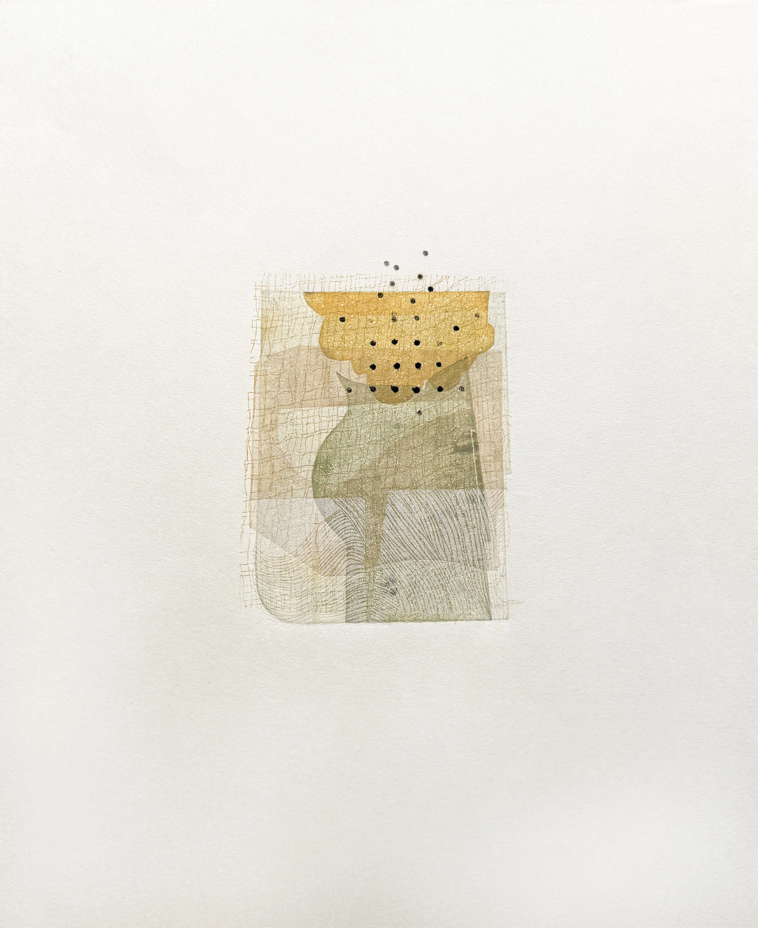 Small, relief print on archival washi paper. Full artwork dimensions are 10.25 × 12.5, while the printed dimension is approximately 3” x 4”. This print is part of a series of numbered and signed, varied edition prints based on the exploration of abstracted letterforms.