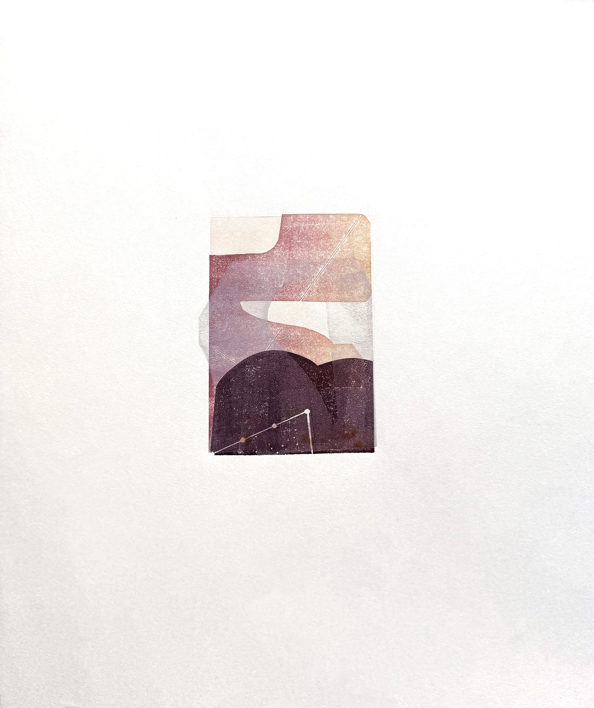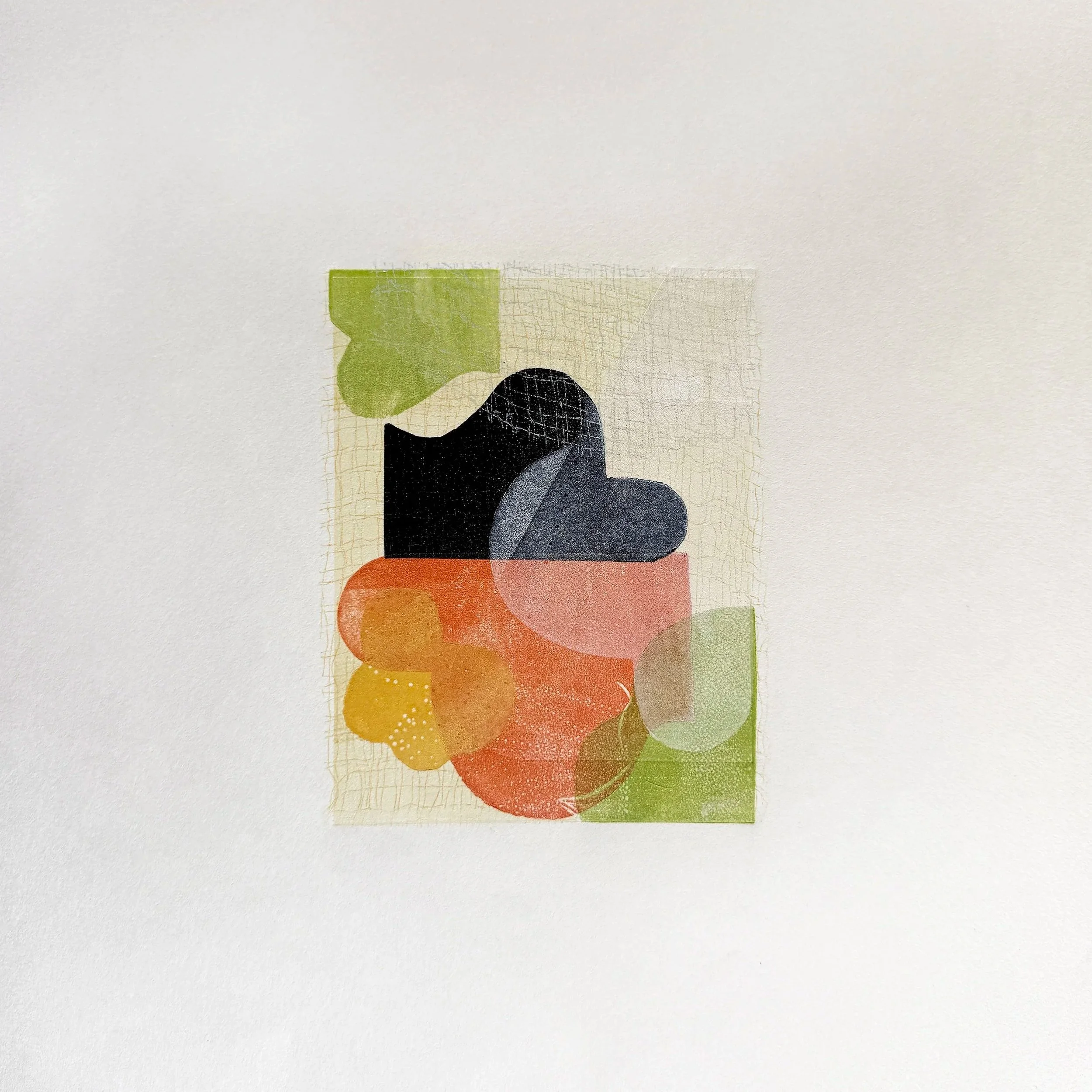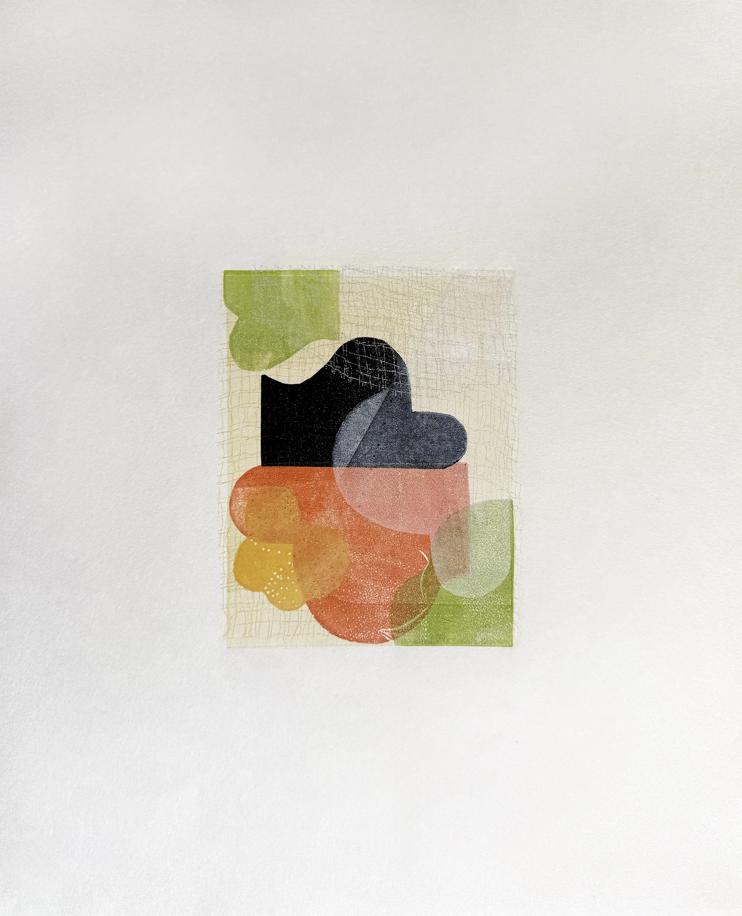 Small, relief print on archival washi paper. Full artwork dimensions are 10.25 × 12.5, while the printed dimension is approximately 3” x 4”. This print is part of a series of numbered and signed, varied edition prints based on the exploration of abstracted letterforms.